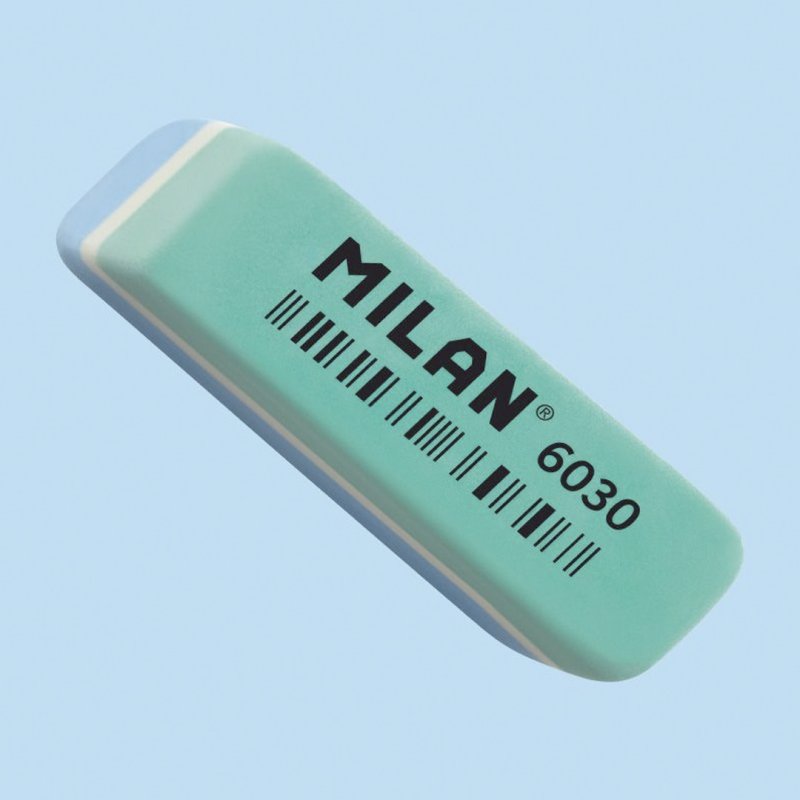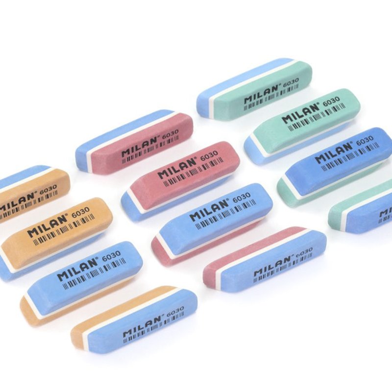 Goma de caucho sintético flexible biselada y bicolor, para borrar lápiz sobre todo tipo de superficies. Colores surtidos: azul, naranja, rojo y verde. Medidas goma: 5,6 x 1,5 x 1,2 cm. Las gomas de borrar MILAN están fabricadas en España desde 1918.