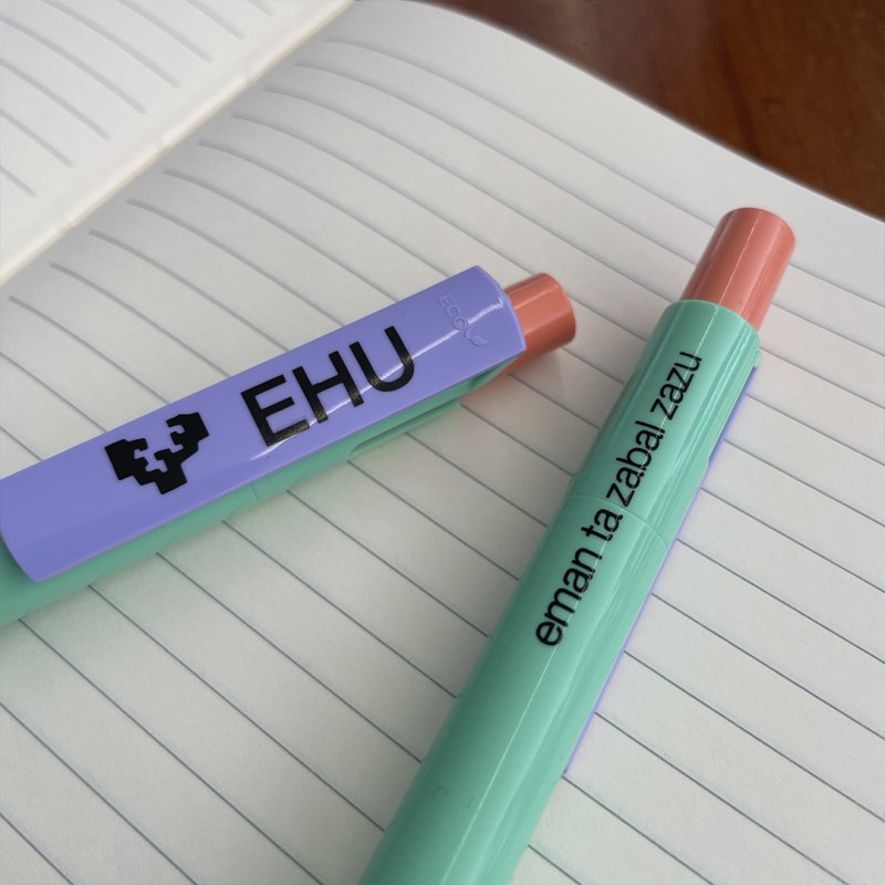 Bolígrafo ecosostenible de tinta azul, personalizado con el logo de la EHU. Una opción responsable y funcional para el día a día, con identidad universitaria.