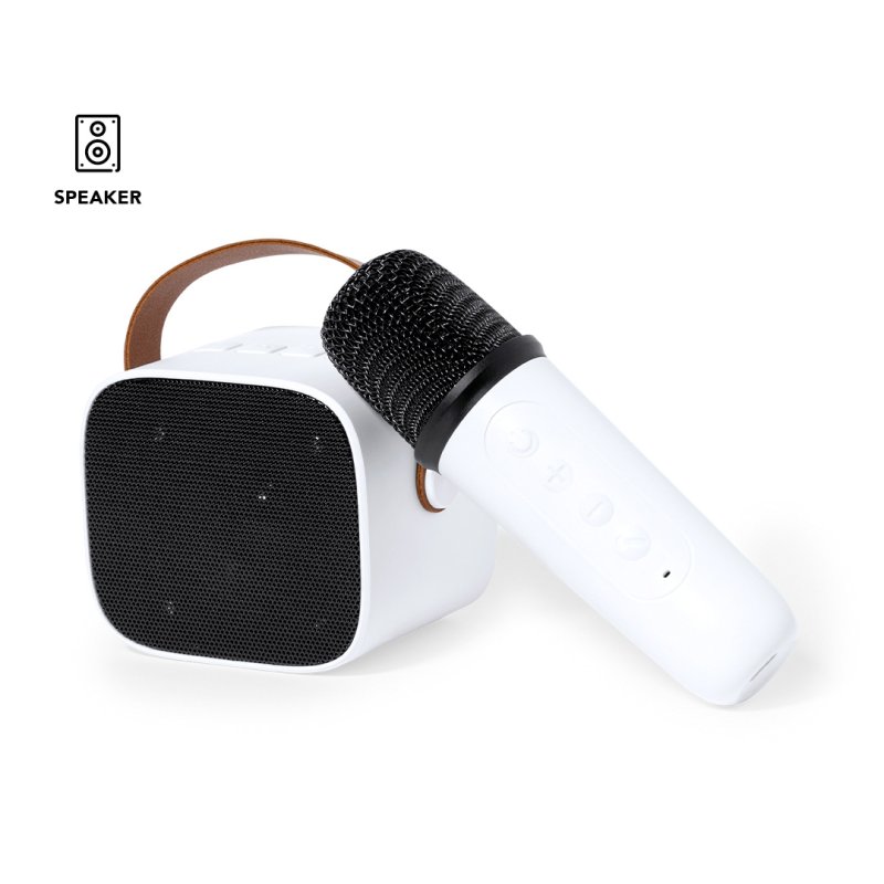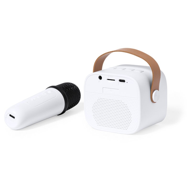 Incluye: Altavoz con práctica asa de transporte en PU. 5W de potencia y batería de 1200 mAh de larga duración. Micrófono con diseño ergonómico a juego para disfrutar de las mejores canciones. Presentado