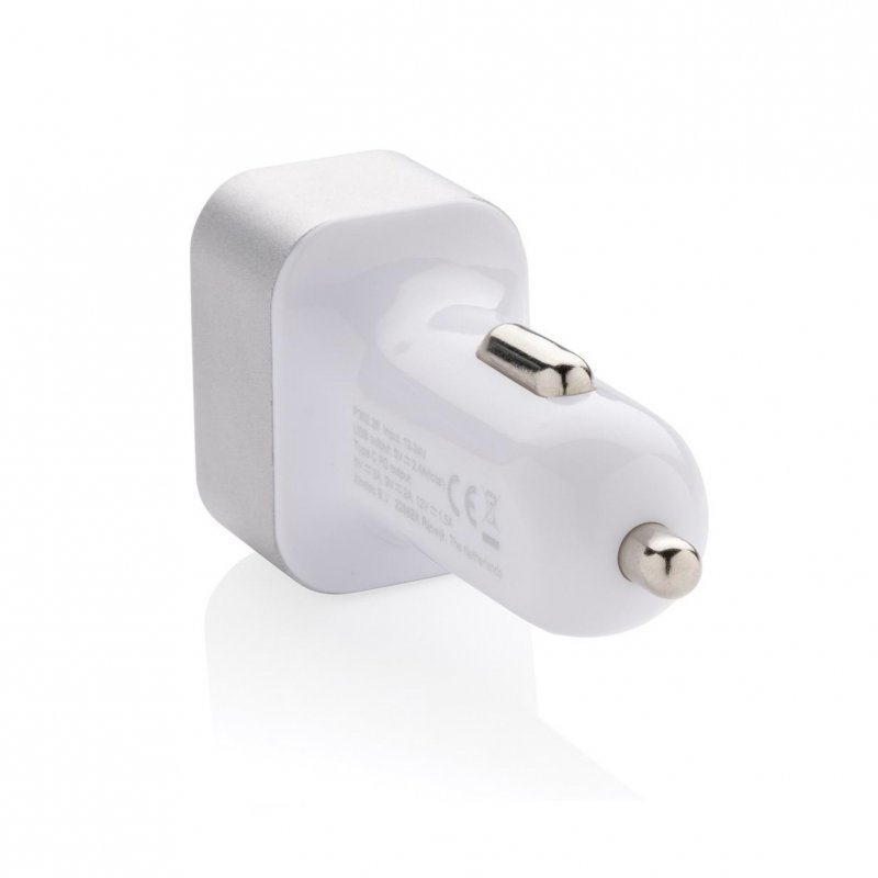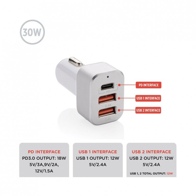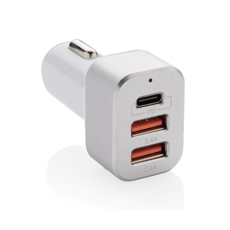 Cargador de coche súper rápido con triple salida. El artículo viene con dos puertos USB normales y una salida USB C que admite la carga rápida de suministro de energía. Esto te permitirá cargar tu dispositivo móvil en menos de una hora si es compatible con la carga de PD. Entrada 12V ~ 24V; Salida tipo C (PD) 5V/3A, 9V/2A, 12V/1.5A; Dos salidas totales USB: 5V/2.4A. Cuerpo de PC y frontal de aleac