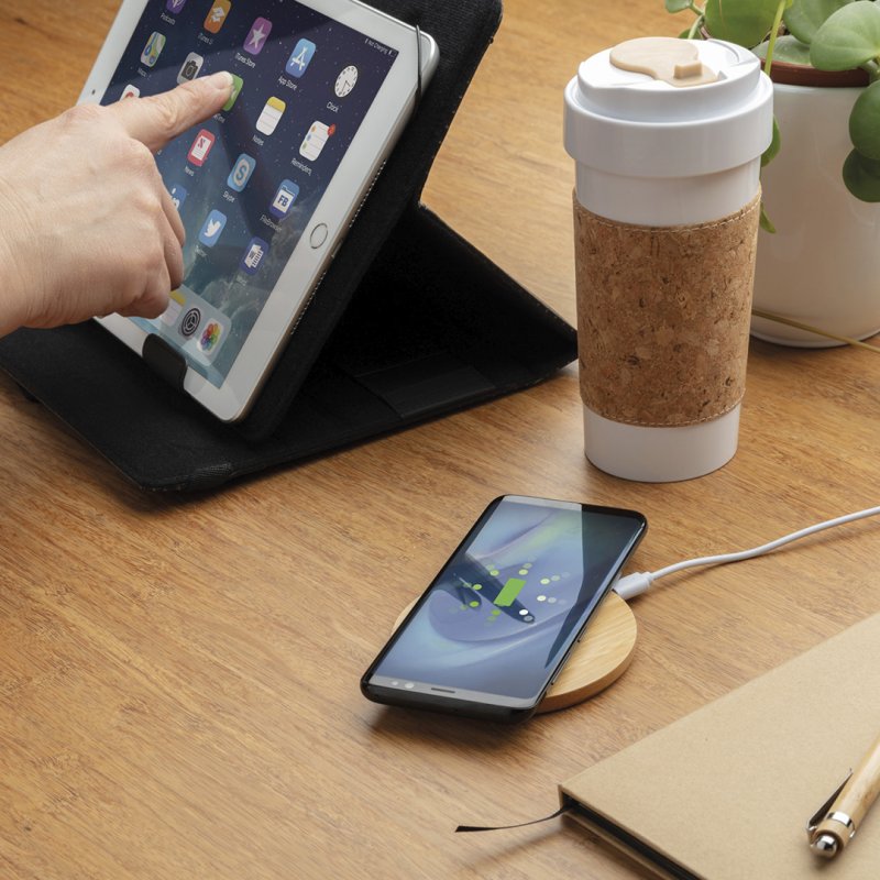 FSC® bambú ● Salida inalámbrica 5W ● Velocidad de entrada 5V/2A ● 1 bobina(s) de carga inalámbrica ● USB-C entrada ● Cable de carga de 150 cm