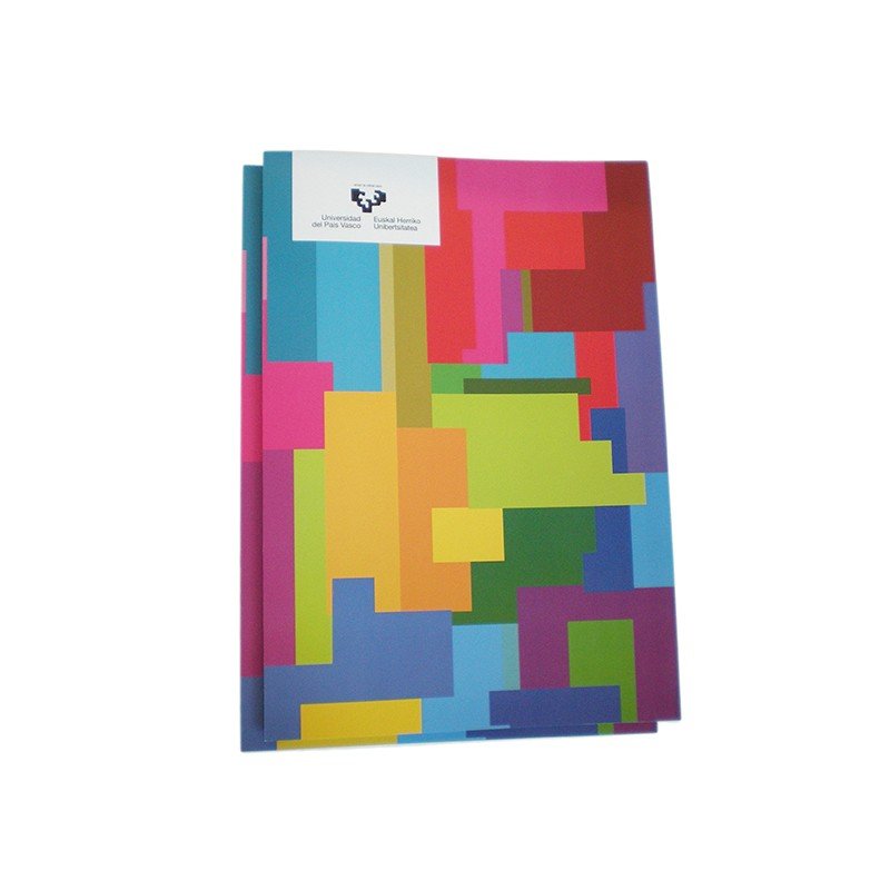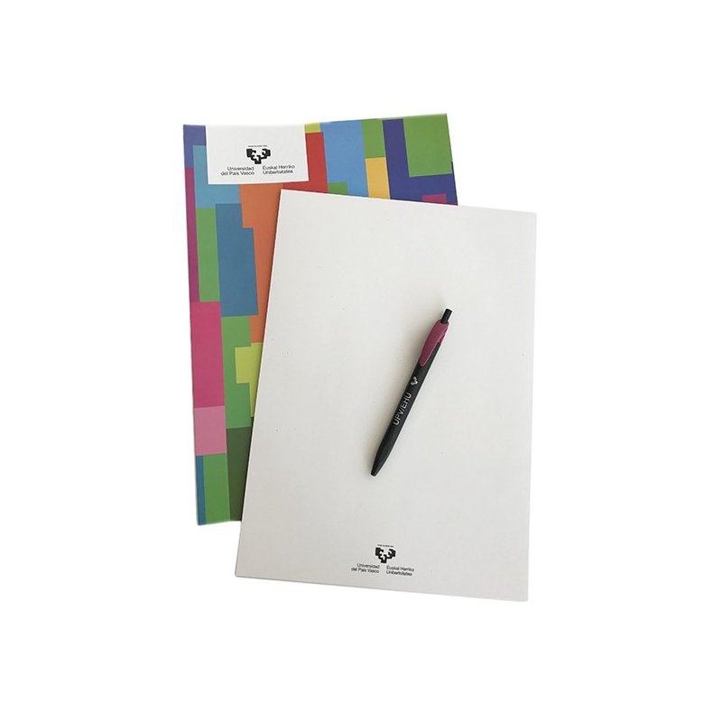Orri zuridun koaderno bertikala, biodegradagarri boligrafoa eta kotoizko poltsa beltza barne duen kongresuetarako lehenego proposamena.