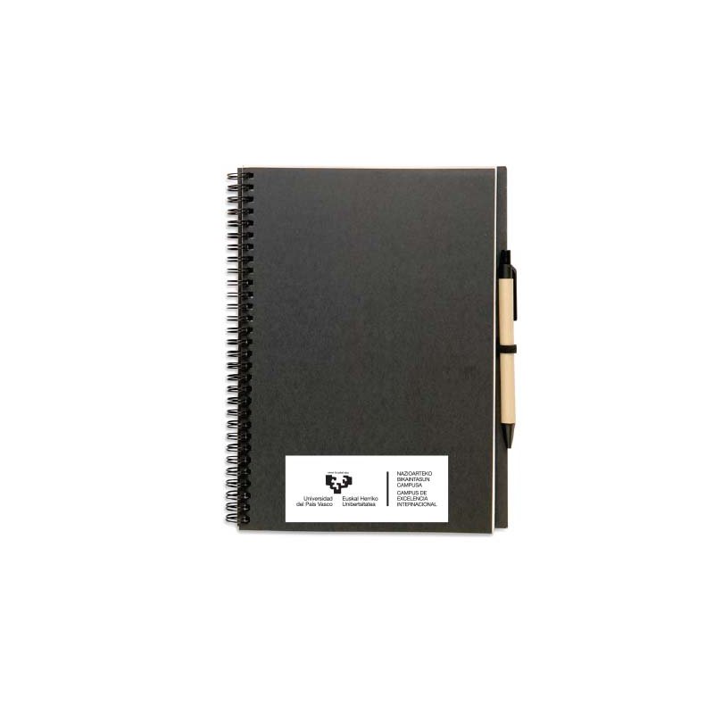 Libreta con cubierta negra o marrón natural con 70 páginas de papel reciclado y un bolígrafo reciclado biodegradable de tinta azul.