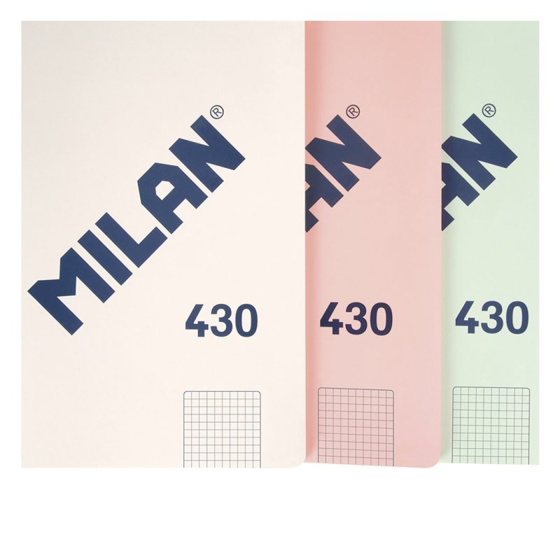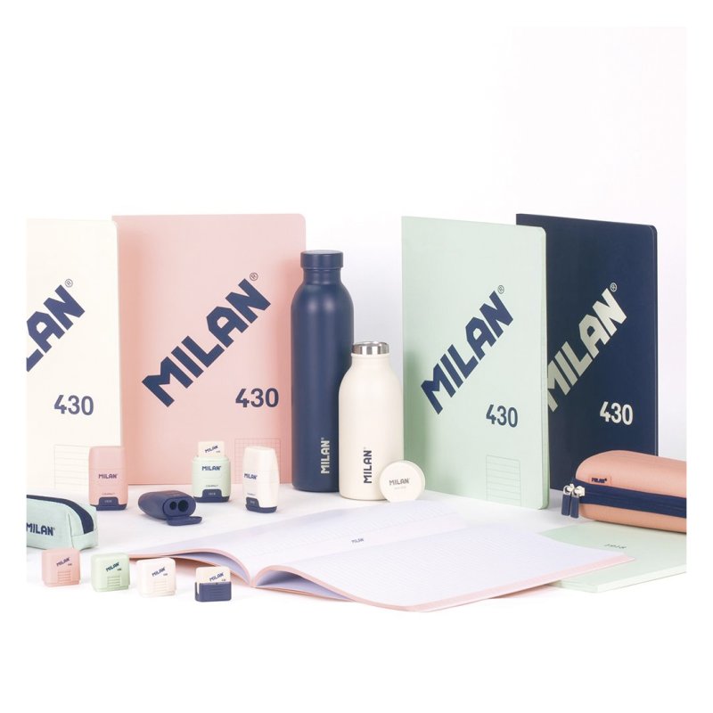 Enkolatutako koadernoa, paper laukiduna, 48 orri, A4. Kolore urdina. Kartoi malguko estalkia eta MILAN logotipoa erliebean. Kalitate handiko 95 gr/m²-ko papera, mikrozulatua. 1918 seriea, 1918tik Espainian fabrikatutako MILAN borragomen jatorrizko kolore eta diseinuan oinarritua.