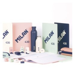 Koaderno enkolatua, paper lineaduna, 48 orri, A4. Kolore urdina. Kartoi malguko estalkia eta MILAN logotipoa erliebean. Kalitate handiko 95 gr/m²-ko papera, mikrozulatua. 1918 seriea, 1918tik Espainian fabrikatutako MILAN borragomen jatorrizko kolore eta diseinuan oinarritua.