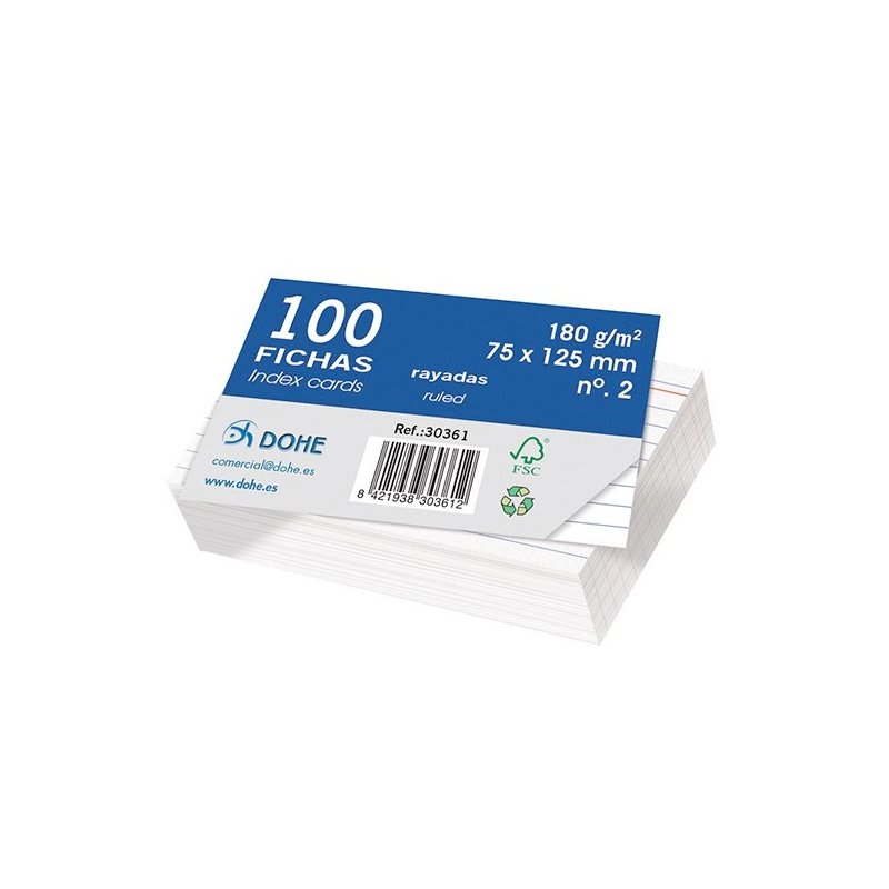 Fichas de cartulina offset blanca de 180 g, rayadas. Se sirven en paquetes de 100 fichas. Con certificado F.S.C.