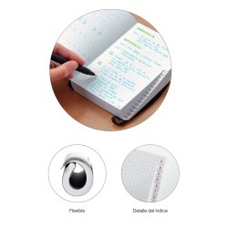 Olana birziklatuzko estalkia, poliuretanozko banda praktiko batekin eta itxitura magnetikoarekin. Koadernoak 80 g/m2-ko barne-paper birziklatuzko 80 orri ditu, inprimaketa marraduna dutenak, eta, beraz, ezin hobeak dira oharrak hartzeko behar guztietarako. RCSk (Recycled Claim Standard) ziurtatutako material birziklatuekin %75 egina