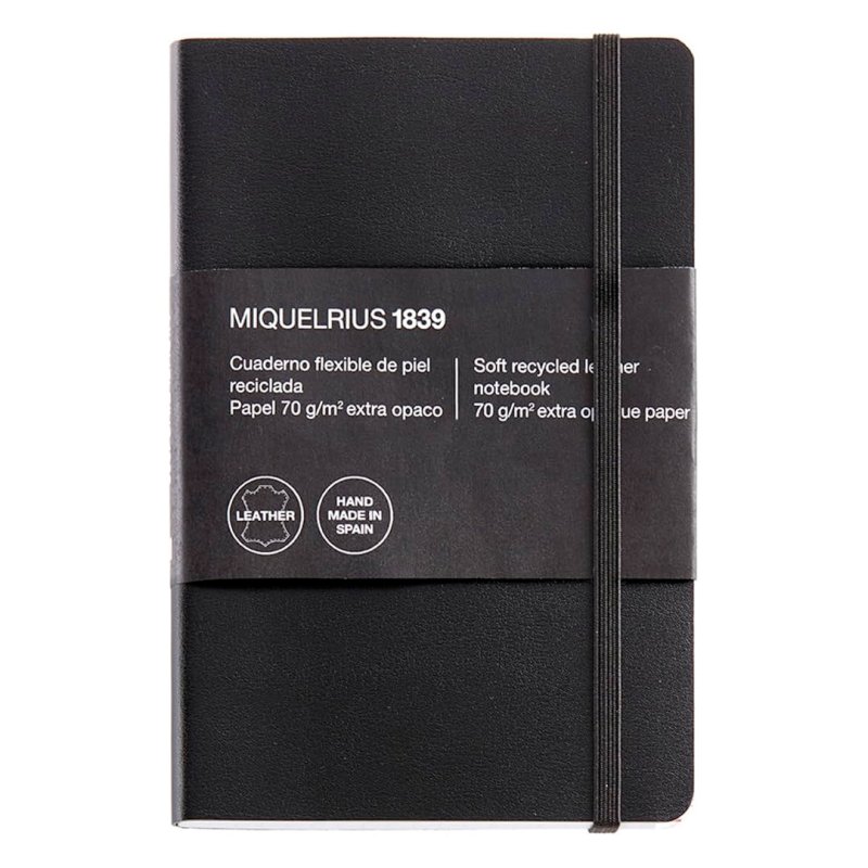 8º CON ÍNDICE 104 X 150 mm Cuadernos flexibles de la máxima calidad. Cubiertas de piel reciclada (75% fibras de cuero + 25% látex natural). Cierre con goma elástica. Faja explicativa. Papel exta opaco de 70 g/m2 con certificación FSC Mix Credit.