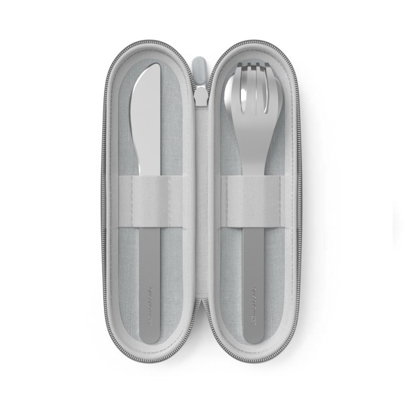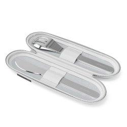 Con su forma alargada y su textura que facilita el agarre, ¡estos cubiertos no te abandonarán! Bien guardados en su estuche de tela gris, tan elegante como práctico, gracias a