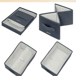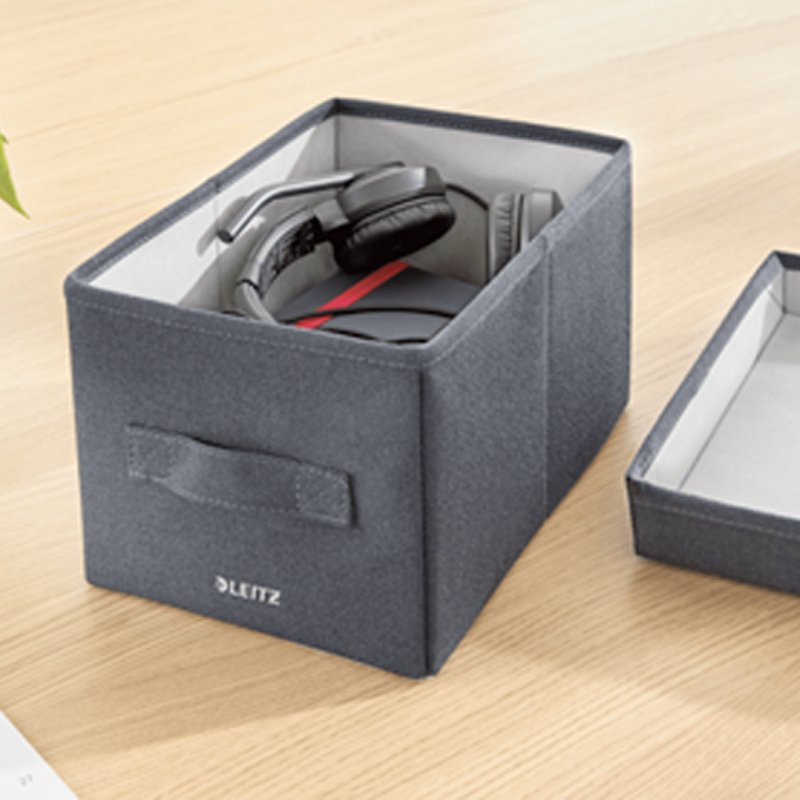 Las cajas de tela para almacenamiento con tapa Leitz son ideales para guardar accesorios de la oficina, como cargadores y grapadoras, y mantenerlos organizados y de fácil acceso. En casa, las cajas de almacenamiento se pueden utilizar para guardar fotografías y otros objetos pequeños en estanterías y unidades