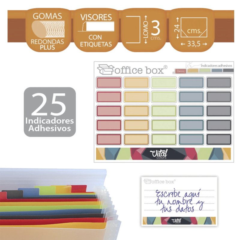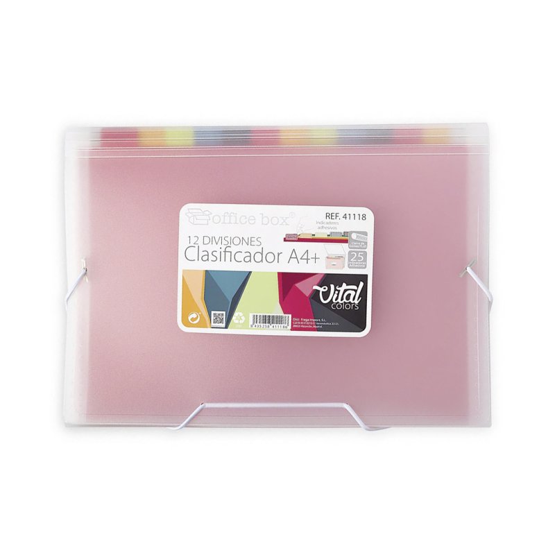 Dokumentuen karpeta sailkatzailea, A4+, bisorea duten 12 bereizgailurekin. Gainera, 25 adierazle itsasgarri ditu, zure dokumentuak beti eskura izan ditzazun. Neurriak: 33.5 x 24 x 3 cm Vital Kolors