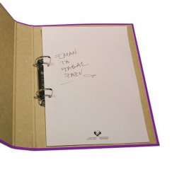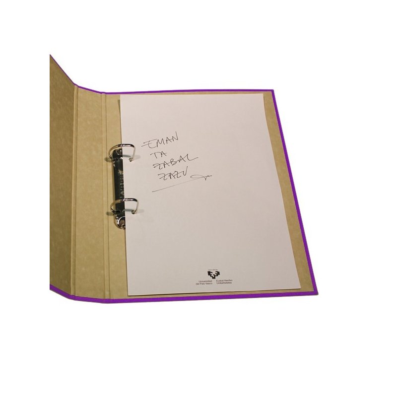 Polipropilenoz forratutako kartoizko karpeta-moduluak. 40 mm-ko eraztun mistoak. Ollao eta txartel-zorroa bizkarrean.