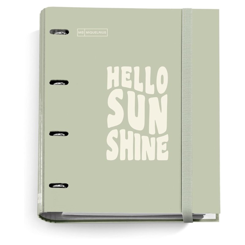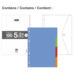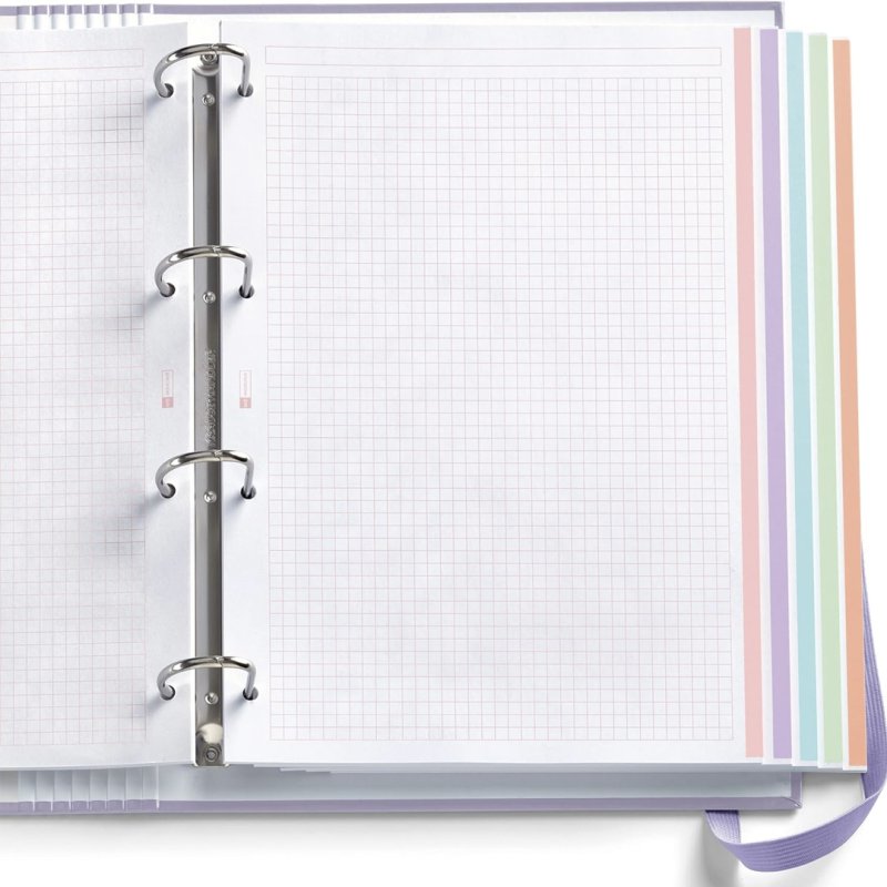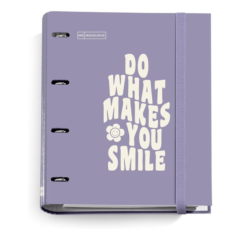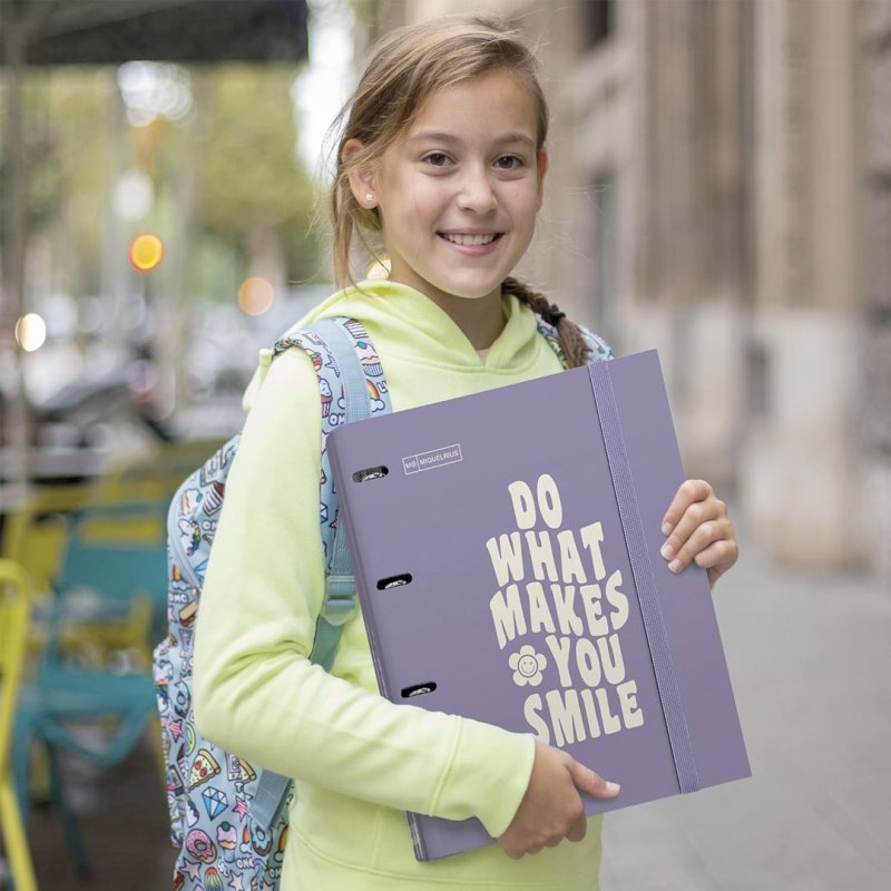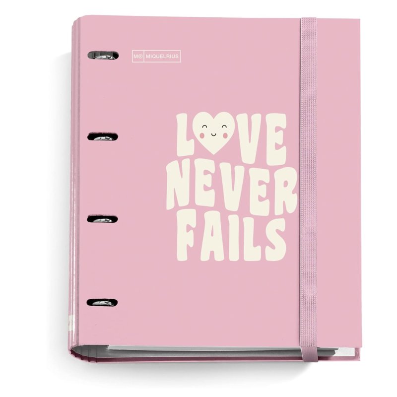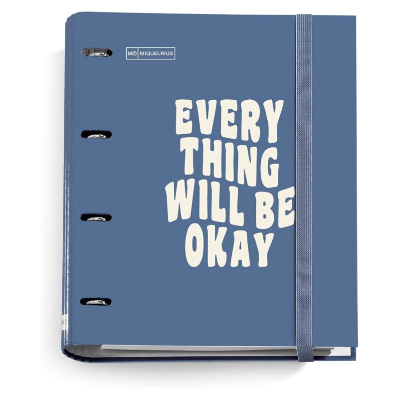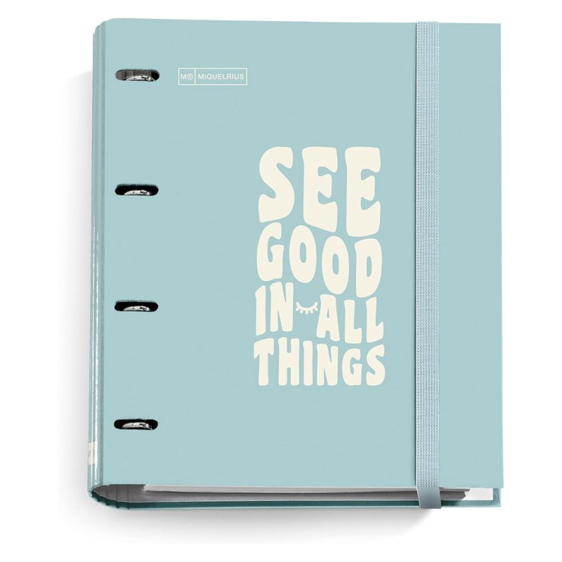 Miquelrius bloka duen karpeta, 330 x 270 mm-ko tamainakoa (A4 tamainako orri eta bloketarako egokia). Estalkiak: Plastifikatu matearekin, trinkoarekin eta erresistentearekin paper inprimatuz forratutako kartoia. Gomaz ixtea. Uztaiak: D motako 4 uztai, 35 mm-ko diametrokoak. Barruko papera bloka barne: 90 g/m²-ko estraopakua