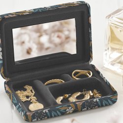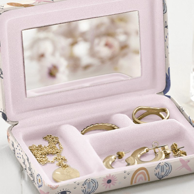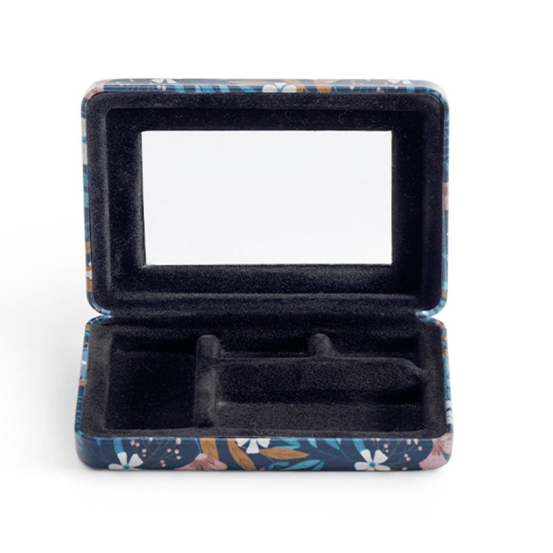 Bidaietarako bitxi-kutxa, praktikoa eta trinkoa, 4 barne-konpartimenturekin eta ispiluarekin.