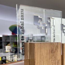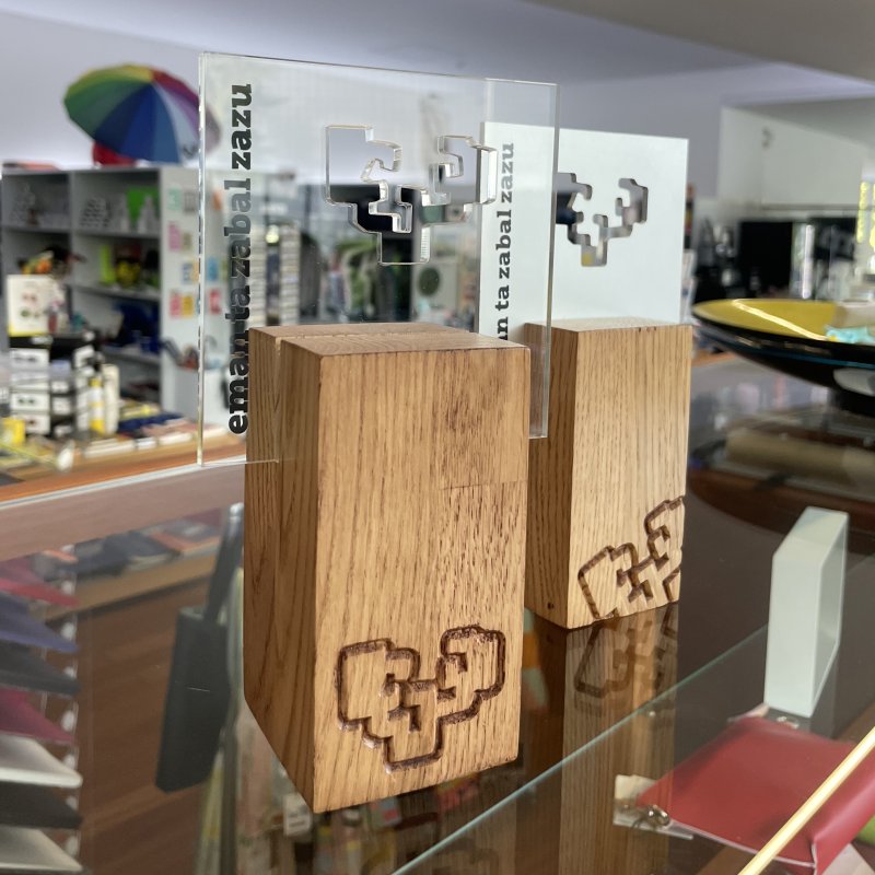 Placa conmemorativa fabricada en cristal grueso y resistente, con base en madera natural. Presentada en estuche de protección kraft, con cierre magnético y espuma interior.