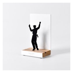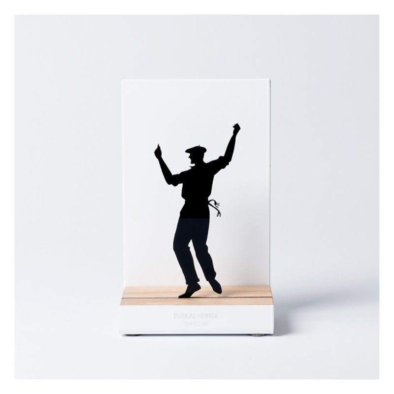 Souven-en irudia. Zuriz lakatutako altzairuzko egitura, haritzezko eta siluazko zurezko oinarria, "Dantzari Mutila" motakoa (Dantzaria), laser bidez moztua, 3 mm-ko lodierako metakrilato beltz distiratsuaren gainean.