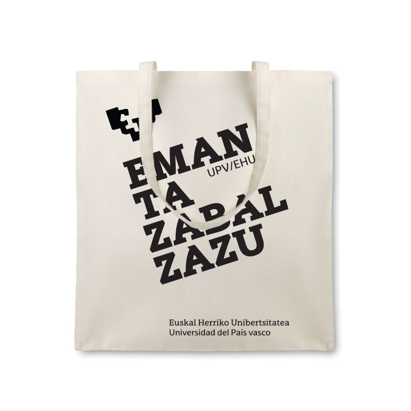 Larruzko eta kotoi birziklatuzko shopper poltsa. Poltsikoak aurrean eta atzean, uhal doigarri eta desmuntagarria, ixteko kremailera eta neurria doitzeko presio-botoiak. Beste poltsiko bat barruan eta forru estanpatua. Neurriak: 400 x 280 x 140 mm.