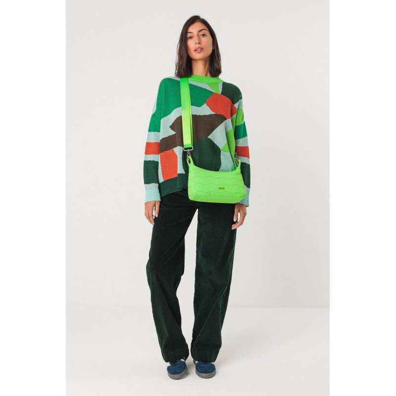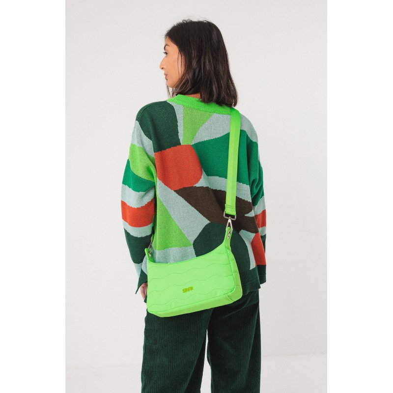 Poltsa txikia material birziklatuekin egina eta sorbaldan eroso eramateko moduko uhal doigarria dakarrena. Bi koloreko estanpatu grafikoa. Kotoi birziklatuarekin, labore lurrak zaintzen laguntzen dugu eta bigarren erabilera bat ematen diegu ehun zatiei.