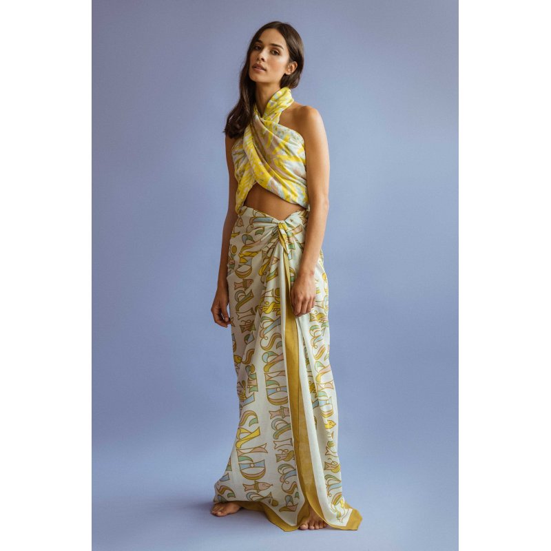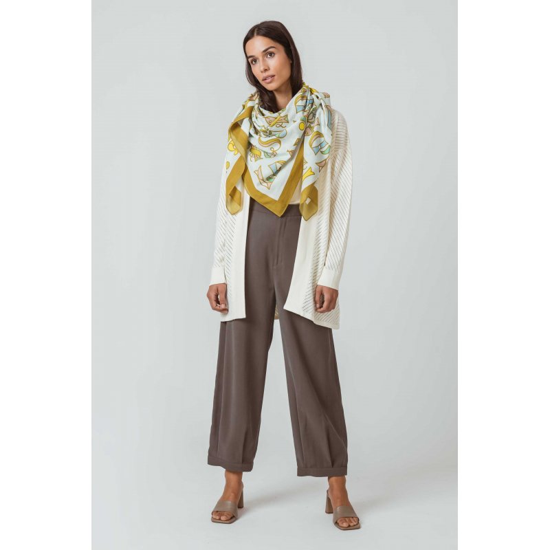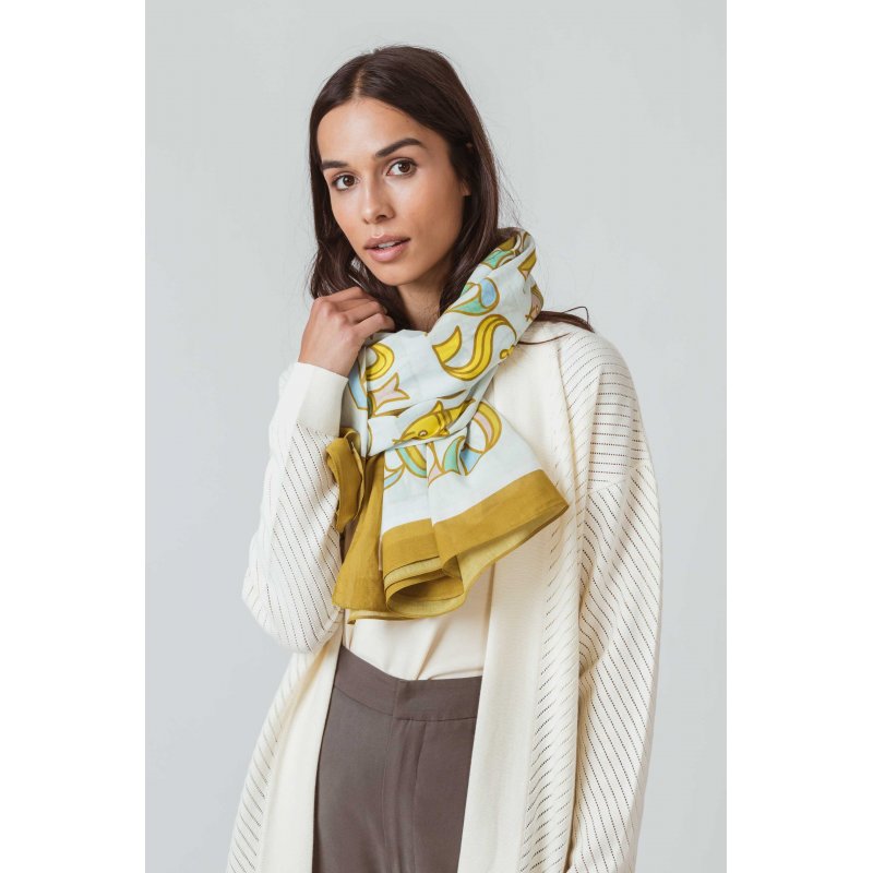 Bufanda laukia, 140 cm x 140 cm, kotoi organiko ziurtagiridunarekin egina. Itsasaldia estanpatua kakian.