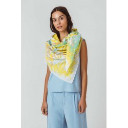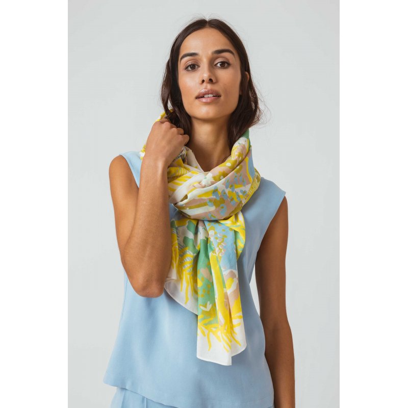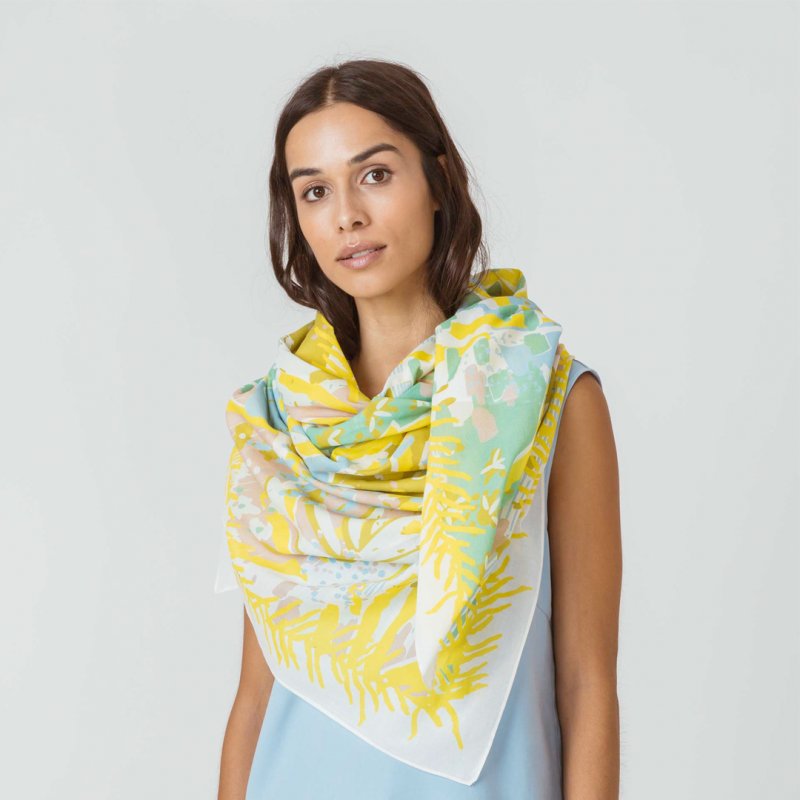 Kotoi organikoa ziurtagiriduna Bufanda laukia, 140 cm x 140 cm, kotoi organiko ziurtagiridunarekin egina. Estanpatu loretsua hori tonuekin.