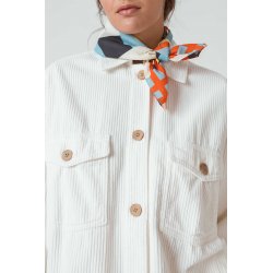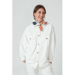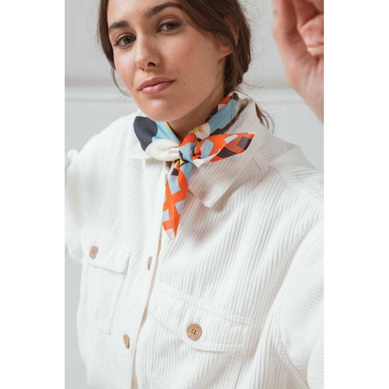 Pañuelo cuadrado grande hecho de algodón orgánico certificado GOTS y BSCI. Estampado multicolor. Estar certificado sienta muy bien. GOTS está reconocida como la principal norma mundial de procesamiento de textiles fabricados con fibras orgánicas. BSCI es un sistema de control social para el abastecimiento ético, cuyo objetivo es mejorar las condiciones de trabajo en la