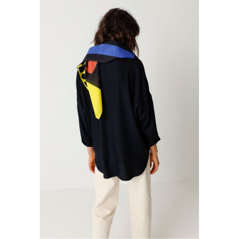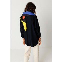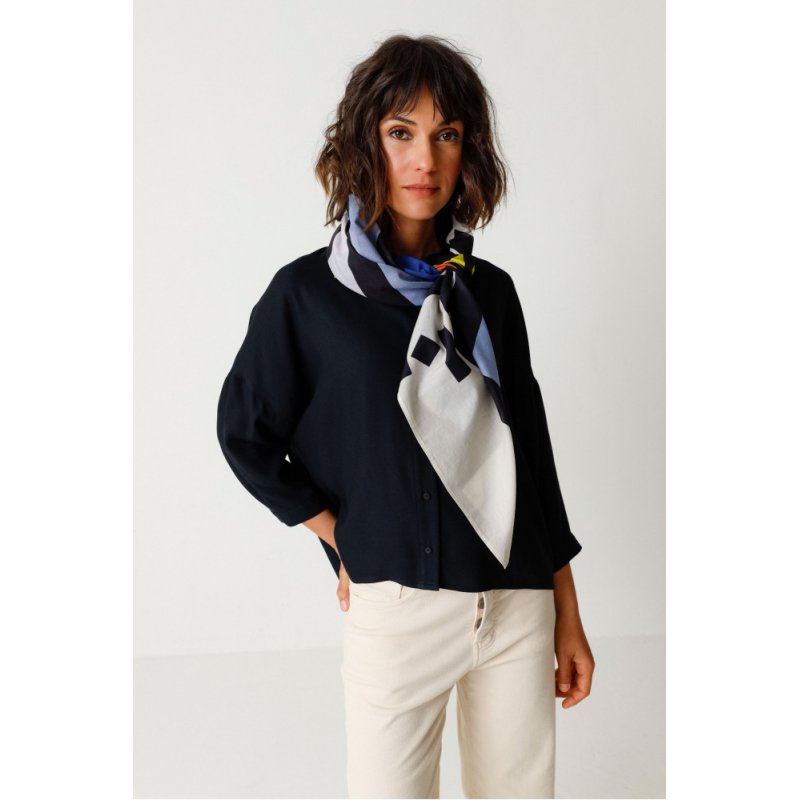 Pañuelo cuadrado grande hecho de algodón orgánico certificado GOTS y BSCI. Estampado multicolor. Estar certificado sienta muy bien. GOTS está reconocida como la principal norma mundial de procesamiento de textiles fabricados con fibras orgánicas. BSCI es un sistema de control social para el abastecimiento ético, cuyo objetivo es mejorar las condiciones de trabajo en la