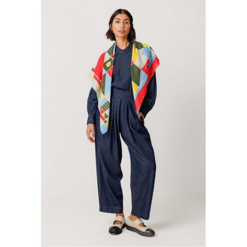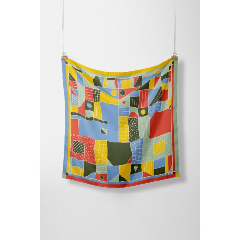 Zapi karratua. Estanpatu geometriko koloreanitza. 110 x 110 cm. GOTS ziurtagiria duen kotoi organikoa.