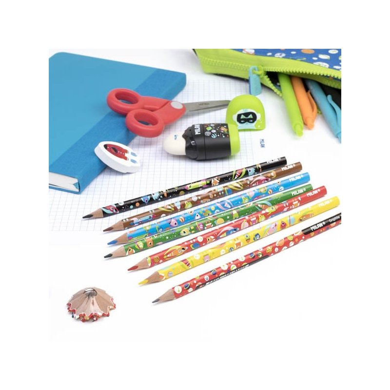 B grafitozko arkatzak. 2,4 mm-ko Ø mina. Forma triangeluar ergonomikoa. Lagradazioa B grafito ertaineko gogortasuna da, eskritura.Meatzeak marra uniforme bat eskaintzen du eta hausturarekiko erresistentea da, LPS sistemari esker (Lead Protection System). Sistema horrek meatzea babesten du, zurarekin bat egiten duelako. Landaketa iraunkorretatik datorren zura.