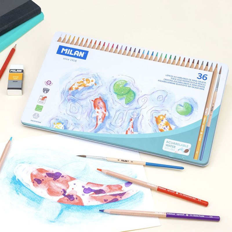 36 lápices de colores acuarelables con mina de gran grosor de 3,5 mm Ø, hexagonales. Contiene 2 colores metalizados: plata y oro. La mina ofrece un trazo uniforme y es resistente a la rotura, debido al sistema LPS (Lead Protection System) que protege la mina gracias a su adhesión con la madera. Madera procedente de plantaciones