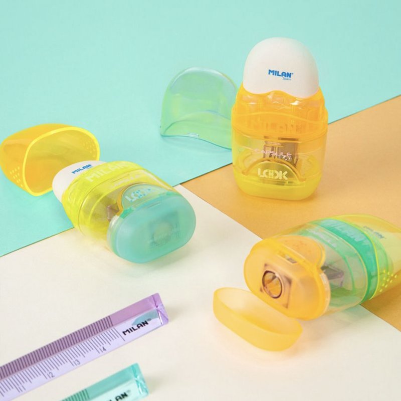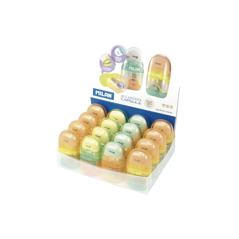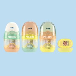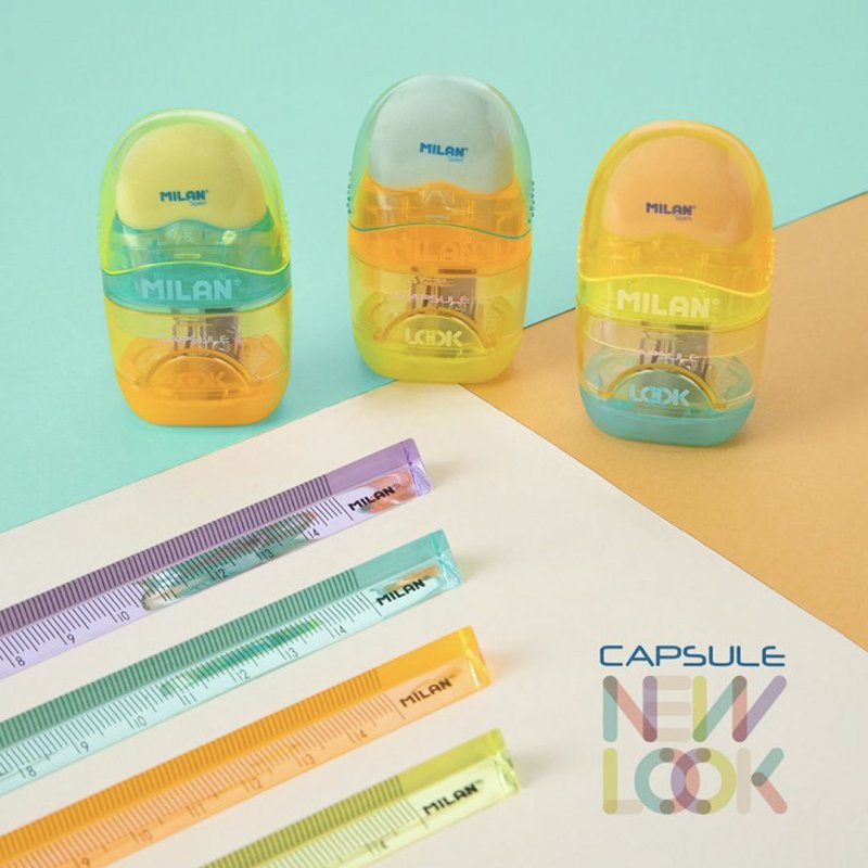 Ezabatzeko gomaren eta zorrozkailuen konbinazioa, tanga estandar batekin. CAPSULE diseinua, New Look seriea. Kautxu sintetikozko goma leuna, 'poan-mamia' motakoa. Zorrozkailuak altzairu zorroztua eta erresistentea duen hortz bat du, arkatz mota guztietarako aproposa. Zorrozkailua segurtasun-hormarekin: sistema honen bidez, orria zorrozkailutik bereiztea saihest