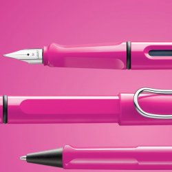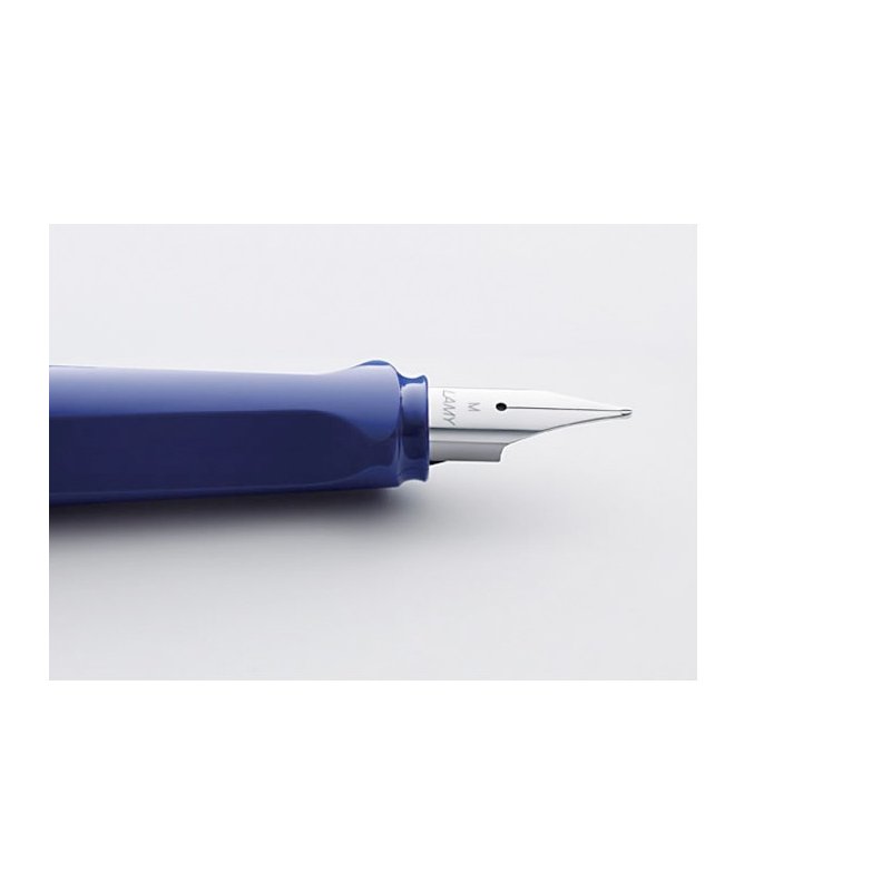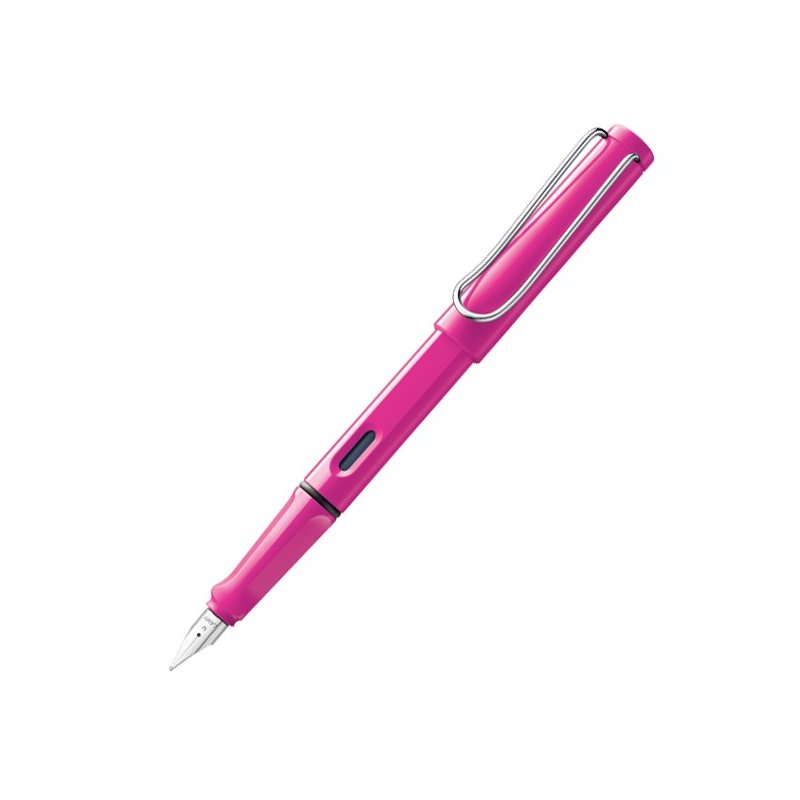 Plástico brillante, colores surtidos (rosa, azul,negro,blanco y rojo). Clip de metal, empuñadura ergonómica, plumín de acero pulido M con cartucho LAMY T 10 azul, se puede utilizar con convertidor LAMY Z 28.