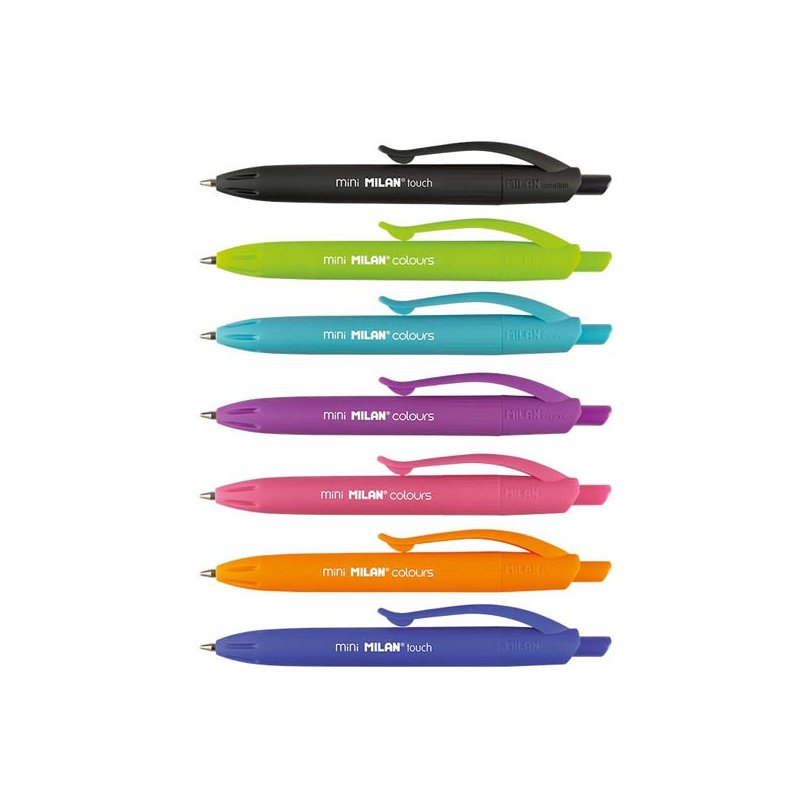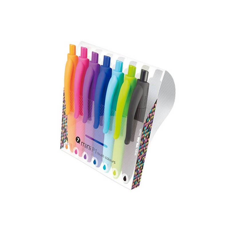 Estuche flexible que contiene 7 bolígrafos mini P1 touch con el cuerpo del mismo color de la tinta: naranja, rosa, lila, azul, azul claro, verde claro y negro. Longitud de escritura aproximada de 600 metros. Punta 1 mm.