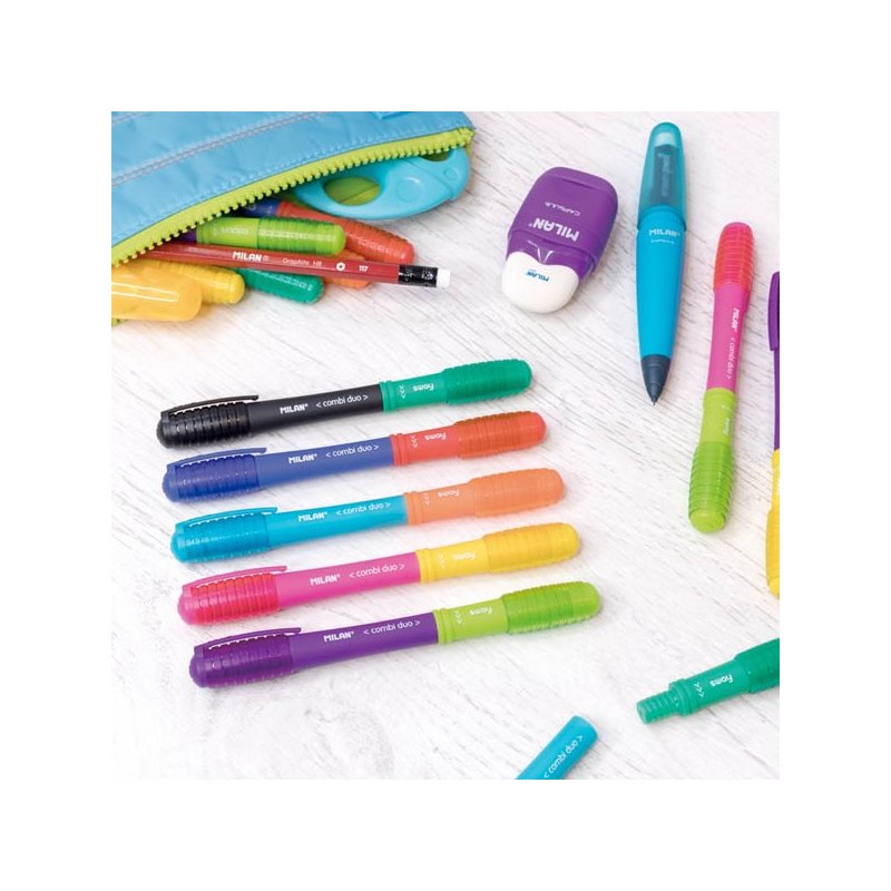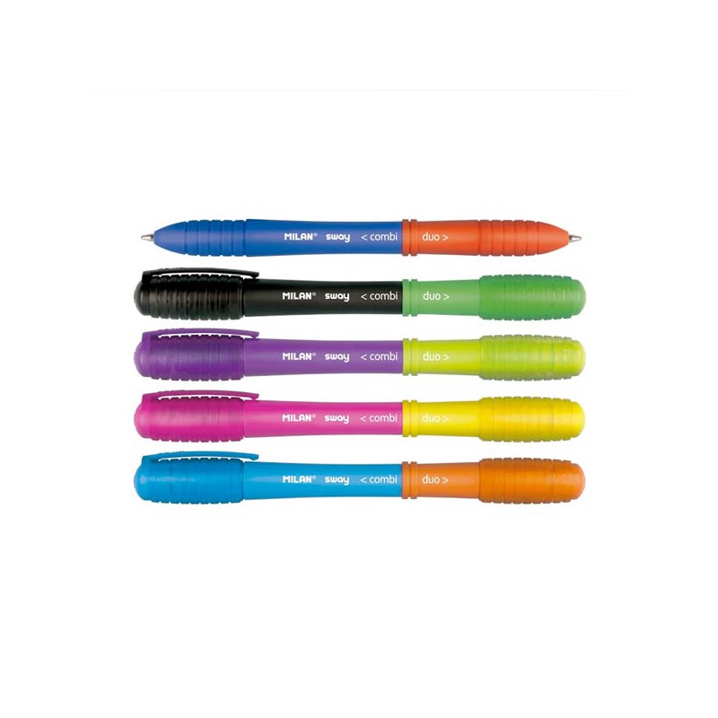 Bolígrafo SWAY Combi Duo con dos puntas fácilmente intercambiables gracias a su sitema rotatorio. 5 bolígrafos de doble punta con 10 colores de tinta disponibles (cuerpo del mismo color que la tinta). La gama completa permite hacer hasta 25 combinaciones distintas. Longitud de escritura aproximada de 650 metros. Punta 1 mm. Diseño original creado por el departamento de I+D de MILAN. Medidas bolígr