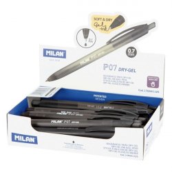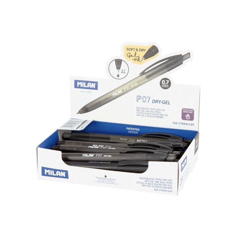 P07 Dry-gel boligrafoa. punta berriarekin eta arin sikatzen den tintaduna (base koipetsua). Tinta kolore berdineko gorputz transluzidoa. 600metrotako idazkera. 0,7mm tako punta. Boligrafo neurriak: 14,1 x 2,1 zm. 1 zm Ø.