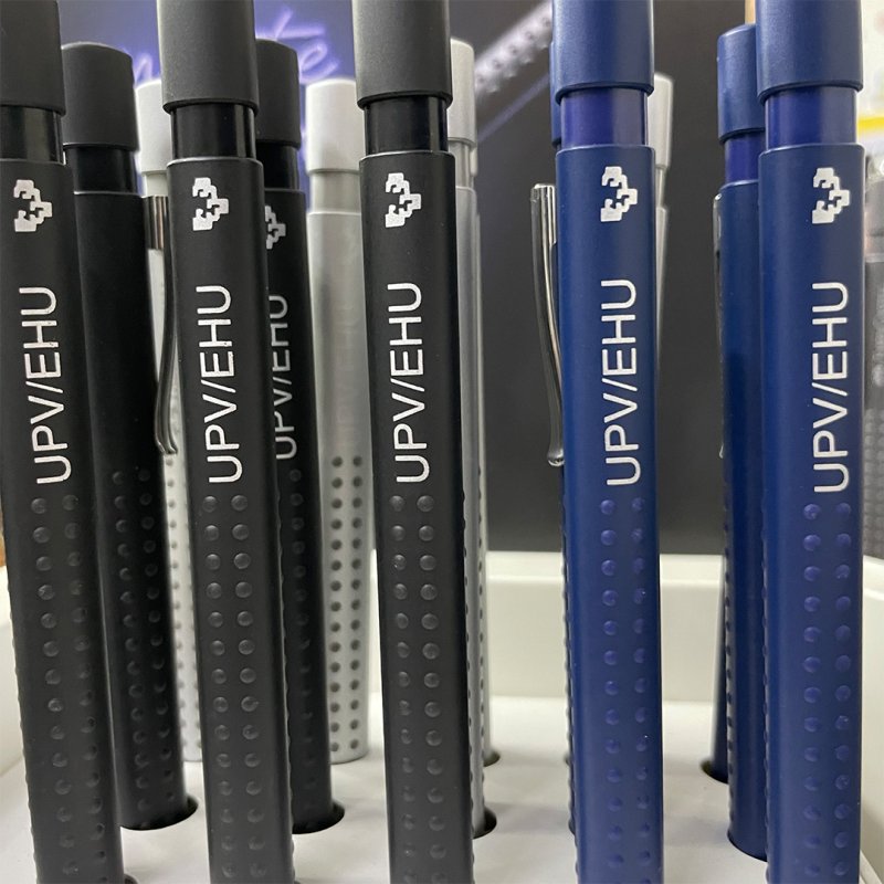 Tinta urdineko boligrafo ekojasangarria, EHUren logoarekin pertsonalizatua. Egunerokorako aukera arduratsu eta funtzionala, identitate unibertsitarioa duena.