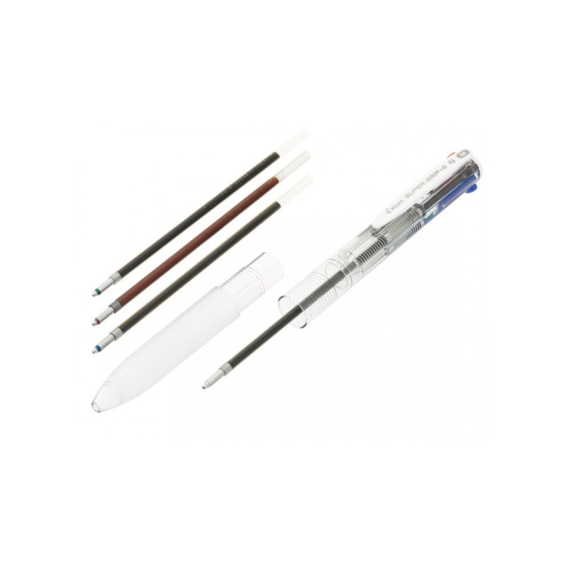 Bolígrafo con escritura en rojo, negro, azul y verde y recambios. 4 bolígrafos en uno.