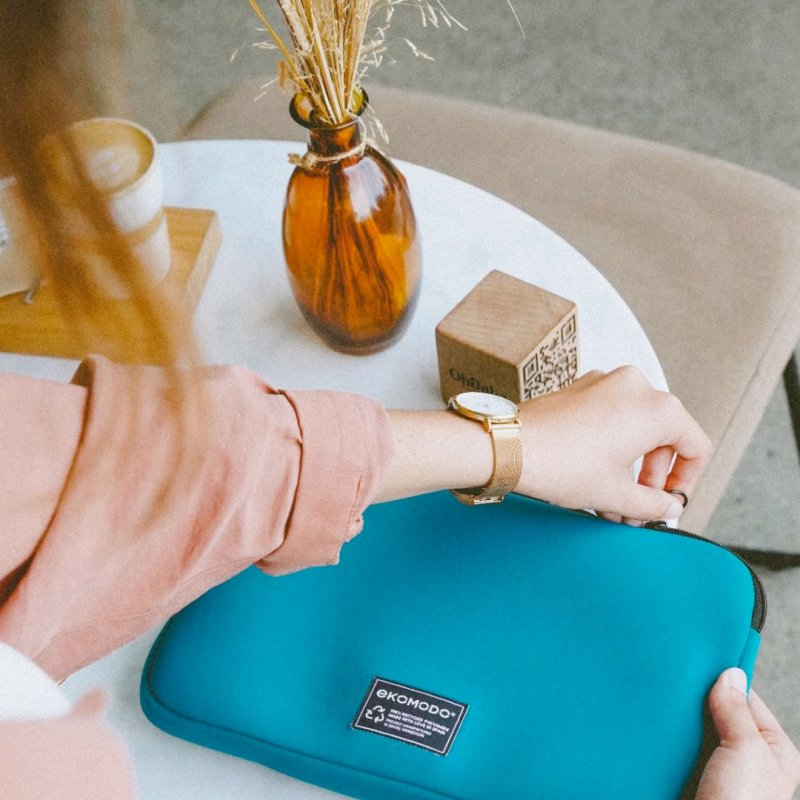 Oihalez egindako poltsa oso mehea, plastiko birziklatuz egina, koloretako xehetasun kontrastagarriekin, ordenagailu eramangarrirako eta MacBookerako. Gailua blokeatzeko neoprenozko belarriak dituen barne-konpartimentu bakarra. Aurrealdea kanpoko poltsiko handi batekin hornituta dago. Atera daitekeen sorbaldako uhala eta zinta bikoitzeko heldulekuak.